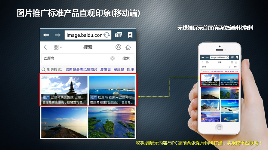 百度圖片推廣是一種針對特定關(guān)鍵詞的網(wǎng)絡(luò)推廣方式,按時間段固定付費(fèi),出現(xiàn)在百度圖片搜索結(jié)果*頁的結(jié)果區(qū)域,不同詞匯價格不同。企業(yè)購買了圖片推廣關(guān)鍵詞后,就會被主動查找這些關(guān)鍵詞的用戶找到并向其展示企業(yè)推廣圖片,給企業(yè)帶來商業(yè)機(jī)會!